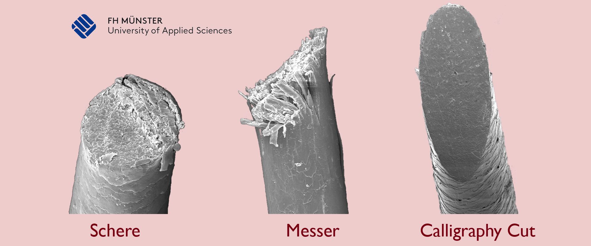 Der Calligraph sichert ein konstantes Schneideergebnis und schont nachhaltig die Haarspitzen. Im Auftrag von calligraphy cut wurde an der FH Münster im Fachbereich Maschinenbau die Schnittoberfläche differenter Haare visualisiert.